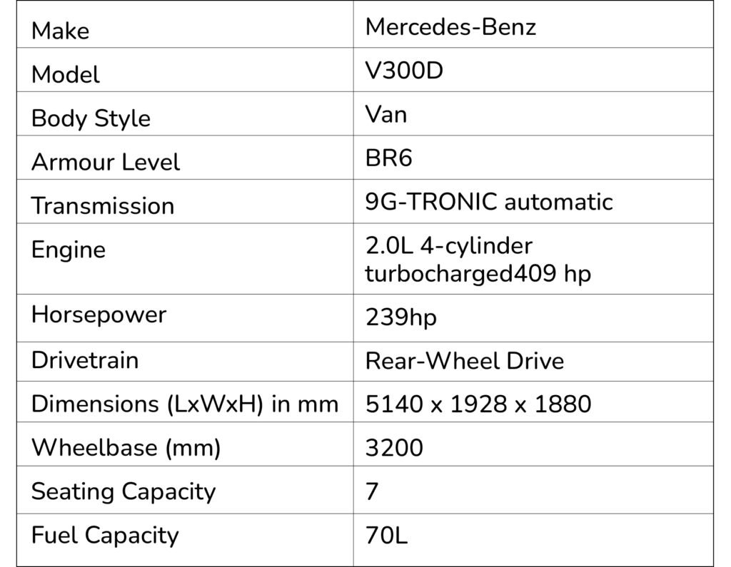 Experience the pinnacle of luxury and security with the Armoured Mercedes V300. Crafted to exceed certified level B6 CEN pr EN 1063 / EN 1522 / 1523 standards, this remarkable vehicle offers exceptional protection without compromising on style and comfort. With its refined design, advanced safety features, and bullet-resistant materials, the Armoured Mercedes V300 provides a secure and opulent environment for both business and leisure travel, redefining the standards of armored vans.